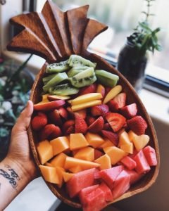2. Salada de frutas com suco de laranja e coco ralado: aqui nessa receita, além do suco de laranja a dica é acrescentar coco ralado e utilizar as frutas da estação – nesse caso, mamão, melão, kiwi, manga e abacaxi.